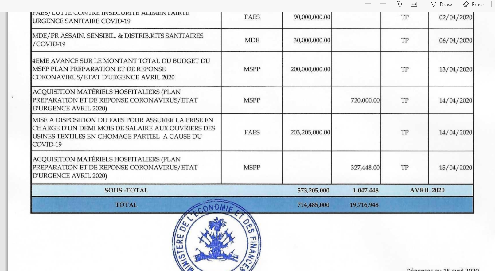 Selon ce tableau des dépenses totalisant 714 millions 485 000 Gourdes, soit environ US $19 millions 716 148, établi par le ministère des Finances, mais qui n’était pas destiné au grand public, le président Jovenel Moise a prévu « d’ assurer la prise en charge d’un demi mois de salaire aux ouvriers des usines textiles en chômage partiel« .
