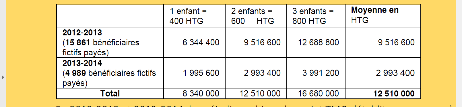 Elle a souligné que « les rapports d’activité produits par le FAES indiquent pourtant que 97 106 bénéficiaires Ti Manman Cheri ont été payés au cours de l’exercice 2012-2013 et 86 234 bénéficiaires ont été payés en 2013-2014« .