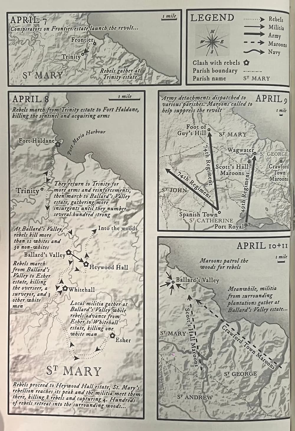 As Senior details, the rebels also armed themselves with improvised ammunition, using lead weights from fishing nets as bullets, while moving from estate to estate—burning, looting, and drawing others into the fight. Her account describes a guerrilla-style campaign, a view reinforced by Brown, who argues that such uprisings involved planning, tactics, and coordination more akin to warfare than spontaneous resistance.
